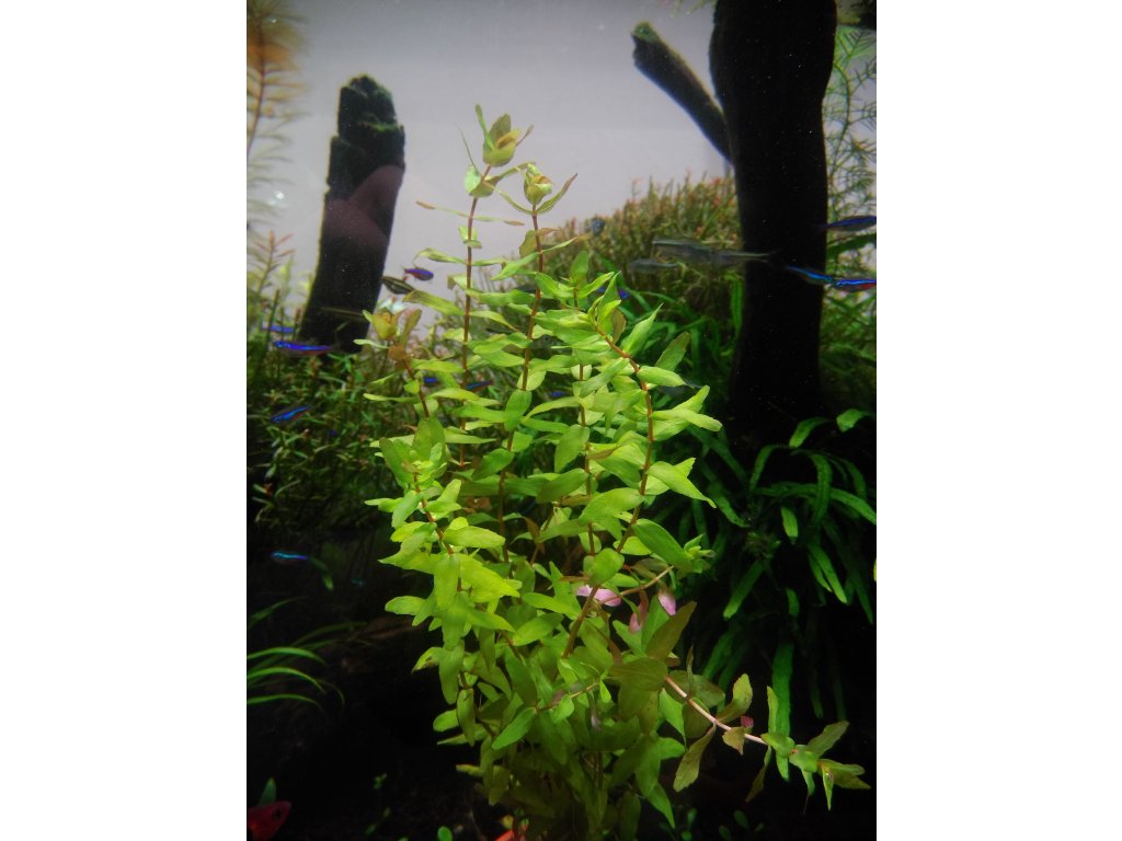 Dekorativní rostlina z Kolumbie s podlouhlými, světle zelenými listy a jemnými bílými květy na hladině. Roste rychle, snadno se množí a je vhodná i pro střední akvária.