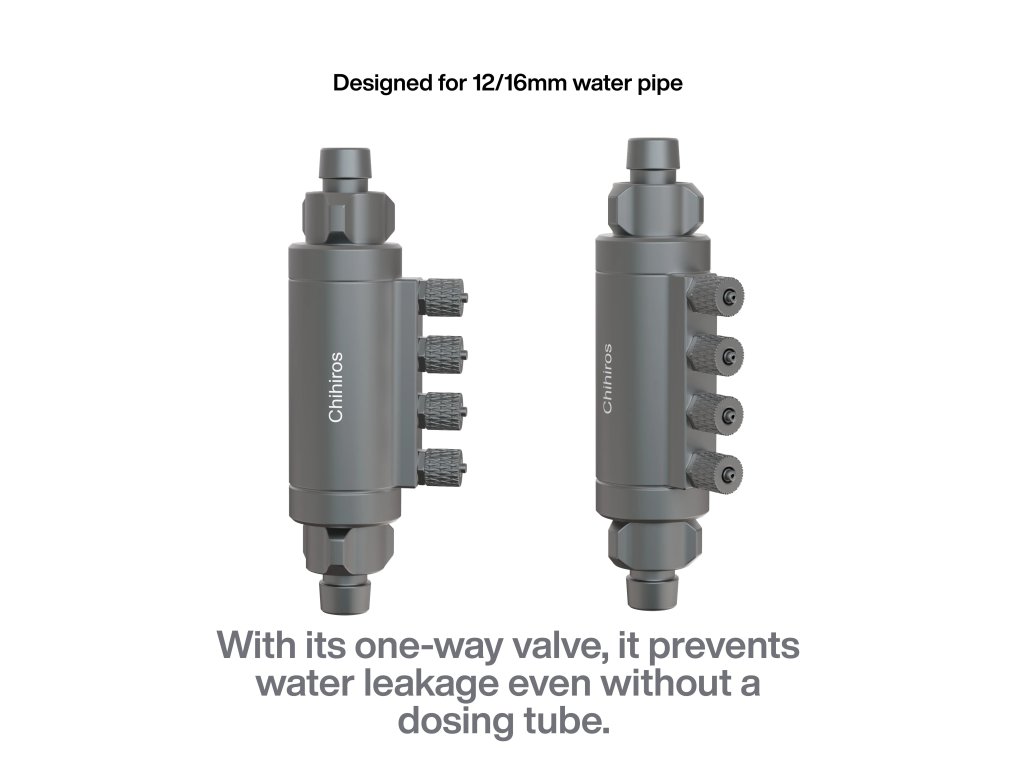 Chihiros Adaptér pro dávkovače hnojiva (Dosing Flow Adapter) je vyroben z odolné hliníkové slitiny a připojuje se přímo na vodní hadici externího filtru. Umožňuje instalaci až 4 dávkovacích portů, z nichž každý je vybaven zpětným ventilem.