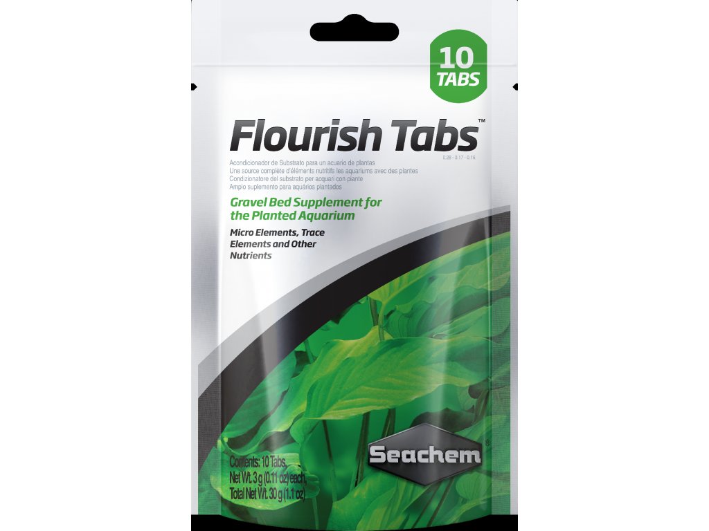 Seachem Flourish Tabs jsou tabletky, které se vkládají do substrátu přímo ke kořenům rostlin. Obsahují mikro živiny, železo, aminokyseliny a vitamíny. Jsou velmi bohaté na obsah železa, manganu, hořčík, vápník, draslík, inositol, vitamín B, biotin a další látky, které byly prokázány našimi testy jako rostlinám prospěšné. Záměrně neobsahují dusík a fosfor (pouze ve stopových, zanedbatelných množstvích). Balíček deseti tablet vystačí na plochu 30 x 80 cm.