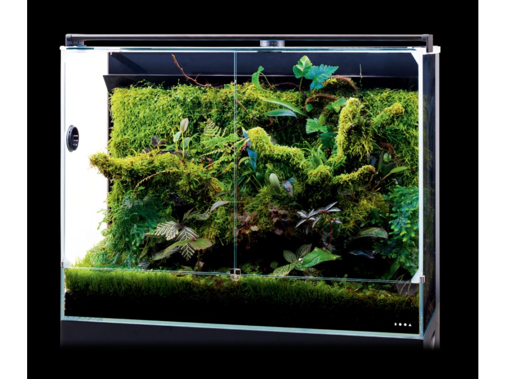 Přední dveře terária lze široce otevřít, aby bylo možné paludárium sadno osadit a bez námahy udržovat biotop domácího deštného pralesa. Na dodávané rohože Wabi-Kusa Mat lze připevnit mechy a rostliny, které se pak připevní k mřížkovému rastru Mistflow boxu. Vznikne tak krásná rostlinná zeď na černém pozadí. Vzhledem k tomu, že Mistflow box není napevno usazen v teráriu, lze jej také vyjmout z nádrže pro případné pozdější úpravy či údržbu.