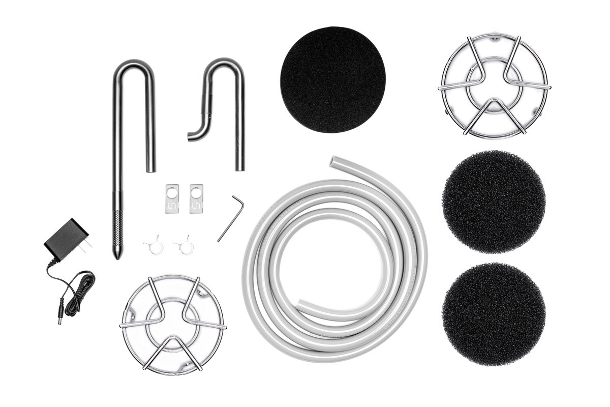 Tělo filtru i potrubí jsou vyrobeny z nerezové oceli, která zajišťuje dlouhou životnost, odolnost a čistý technický vzhled. Povrchová úprava v gunmetal odstínu a robustní kovové přezky dodávají filtru elegantní, profesionální charakter – ideální volba pro otevřená a designová akvária.